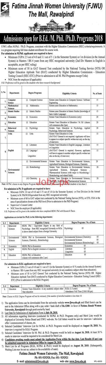 Fatima Jinnah Women University FJWU Admission in B.Ed, Mphill and Phd in The Mall Rawalpindi. Admission Open for Both Male / Female Students Morning / Evening Classes. Read newspaper ad for exact details.