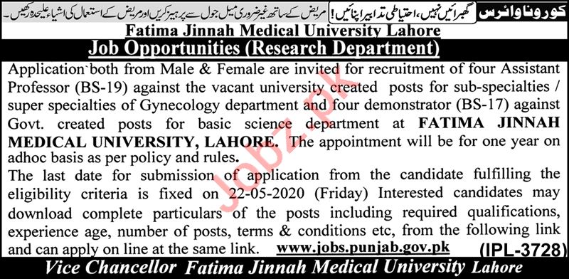 Vacancies in Fatima Jinnah Women University Advertisement May 2020