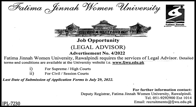 Fatima Jinnah Women University Rawalpindi, rawalpindi Punjab Pakistan invites applications from eligible candidates for the post of legal advisor as per advertisement of July 9, 2022 published in daily Nawaiwaqt Newspaper. Preferred Education is BA and LLb etc.