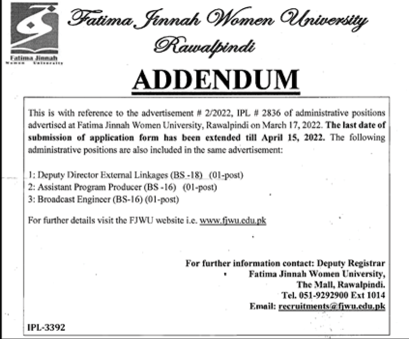 Fatima Jinnah Women University Rawalpindi Jobs Addendum 2022