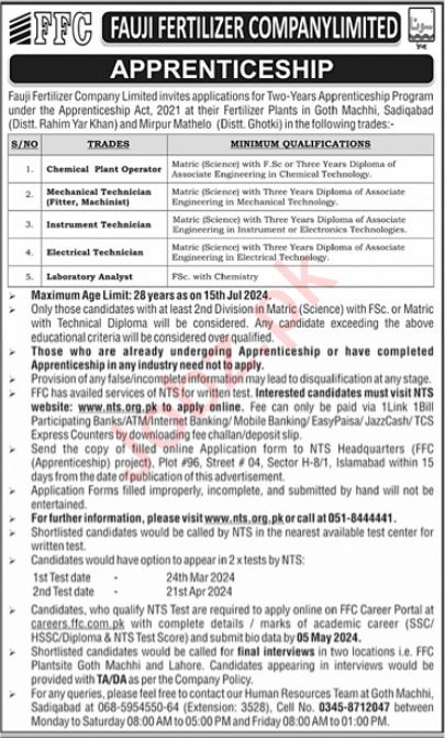Fauji Fertilizer Company FFC jobs advertisement dated about 25 February 2024 in daily Jang Newspaper invites application for the vacant post of electrical technician, laboratory analyst, chemical plant operator, instrument technician and mechanical technician in Rahim Yar Khan, rahim yar khan Punjab Pakistan. Candidates with Intermediate and Matric etc. educational background will be preferred.