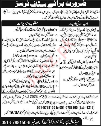 Fauji Foundation Hospital invites applications for job positions advertised in daily Express dated 1 September 2024 for following vacancies in Rawalpindi, rawalpindi Punjab Pakistan.