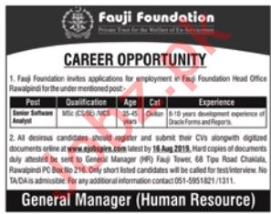 Fauji Foundation is seeking services of qualified, energetic and experienced candidates for the posts of Senior Software Analyst in Rawalpindi. Candidates must have Maters degree with 8 to 10 years of experience. Interested candidates can apply till August 16, 2019.