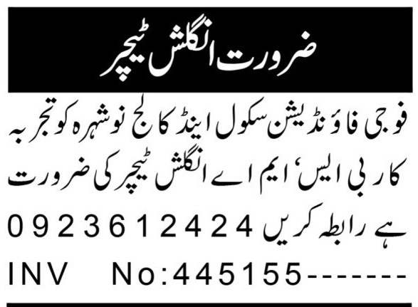 Fauji Foundation Schools jobs advertisement dated about 19 September 2025 in daily Aaj Newspaper invites application for the vacant post of teacher and english teacher in Nowshera, nowshera Khyber Pakhtunkhwa KPK Pakistan. Educational qualifications required MA etc.