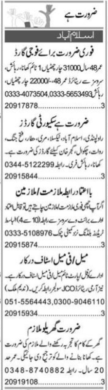 Vacant posts including fauji guard, male female staff and security guard are announced in Private Islamabad, islamabad Islamabad Pakistan as per 15 December 2023 advertisement in daily Express Newspaper. Bachelor, Master, Intermediate, Matric and Middle etc. educational qualification will be preferred.