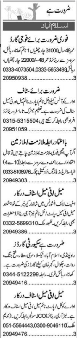 Private Company Islamabad, islamabad Islamabad Pakistan invites applications from eligible candidates for the post of security guard, state life insurance staff, fauji guard and male female staff as per advertisement of November 2, 2024 published in daily Express Newspaper. Bachelor, Intermediate, Matric and Middle etc. educational qualification will be preferred.