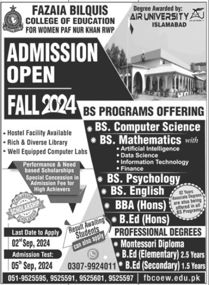 Fazaia Bilquis College of Education has announced admissions 2024 for Computer Science, Mathematics, Data Science, Information Technology, Finance, Psychology, Montessori Diploma . Students who want to take admissions in Fazaia Bilquis College of Education Rawalpindi Punjab Pakistan for academic year 2024 to continue education in Teaching College can apply. Students who want to enroll for academic session 2024 in BBA, B.ed, BS and Diploma qualification and admission criteria for Government institute can apply till last date 2 September 2024. Read newspaper ad for exact details.
