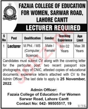 Vacant posts including lecturer computer science and lecturer are announced in Fazaia College of Education For Women Lahore, lahore Punjab Pakistan as per 20 November 2022 advertisement in daily Jang Newspaper. Persons with Mphil and MS etc. education can apply.