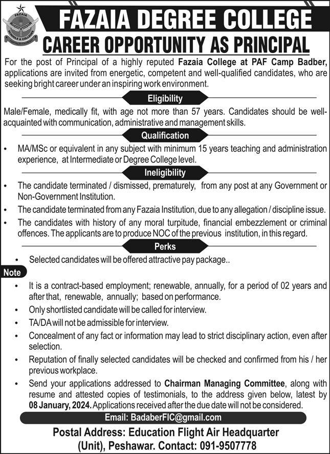 Pakistan Air Force PAF, Fazaia Degree College Peshawar, peshawar Khyber Pakhtunkhwa KPK Pakistan invites applications from eligible candidates for the post of principal as per advertisement of December 26, 2023 published in daily Express Newspaper. Preferred Education is Master, M.sc and MA etc.