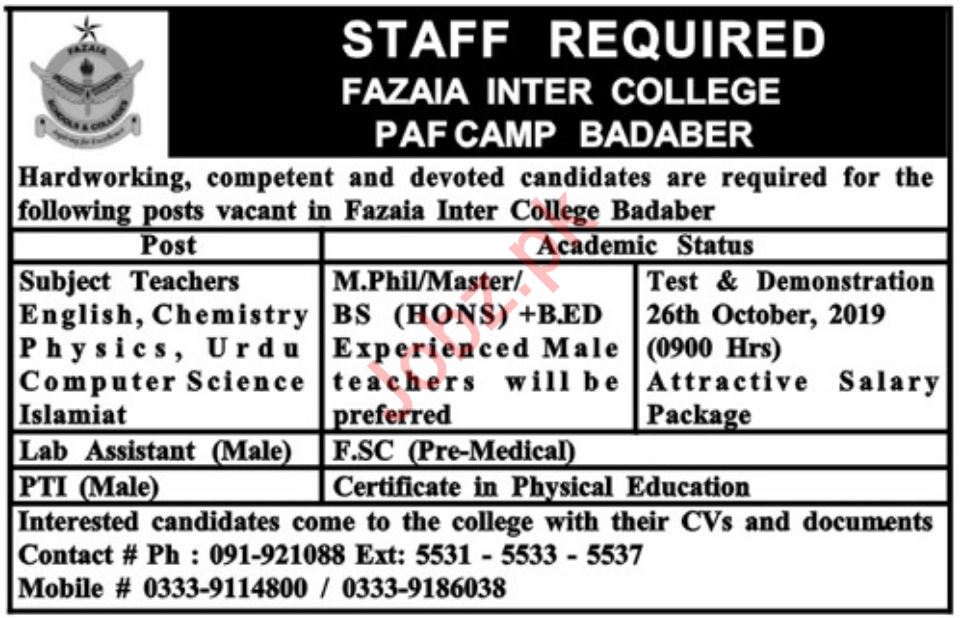 Vacancies in Fazaia Inter College Advertisement October 2019
