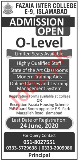 Fazaia Inter College E 9 Islamabad Admissions 2020