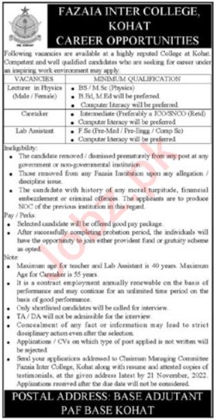 Vacant posts including caretaker, lecturer and lab assistant are announced in Fazaia Inter College Kohat, kohat Khyber Pakhtunkhwa KPK Pakistan as per 13 November 2022 advertisement in daily Mashriq Newspaper. Educational qualifications required M.sc, B.ed, Intermediate and M.ed etc.