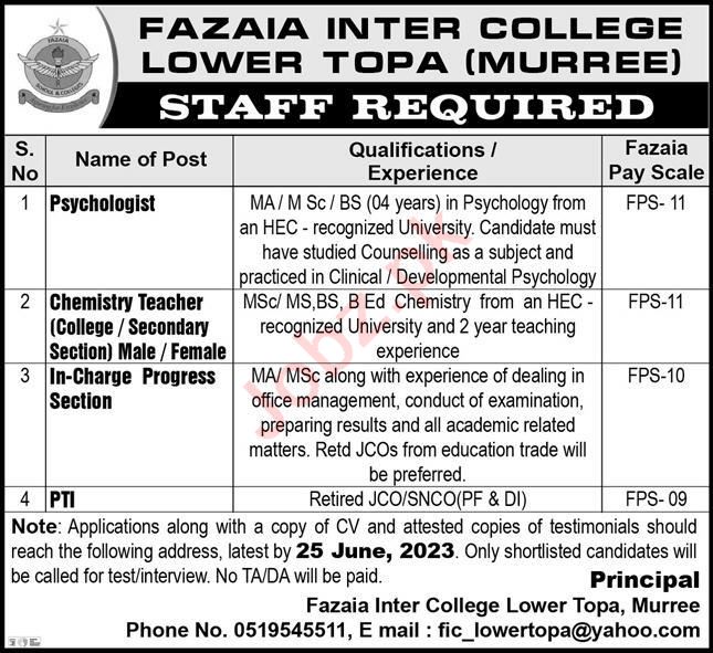 Vacant posts including physical training instructor, incharge progress section, psychologist, pti and chemistry teacher are announced in Fazaia Inter College Murree established by Pakistan Air Force PAF , murree Punjab Pakistan as per 11 June 2023 advertisement in daily Express Newspaper. Persons with B.ed, Master, M.sc, MA and Bachelor etc. education can apply.