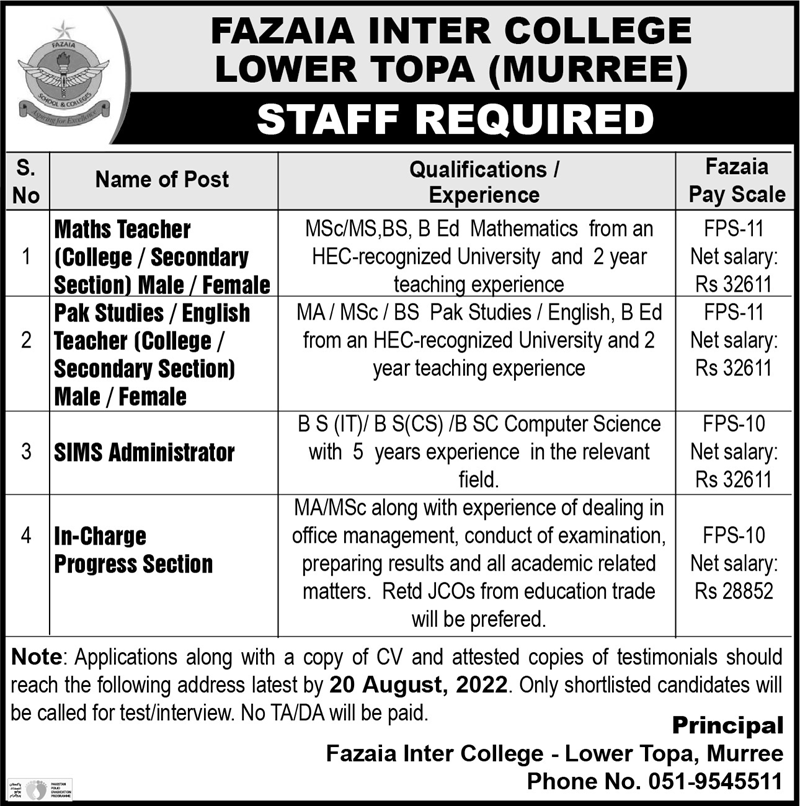 Vacant posts including pak study teacher, english teacher, sims administrator, maths teachers and incharge progress section are announced in Fazaia Inter College Murree, murree Punjab Pakistan as per 17 August 2022 advertisement in daily Nawaiwaqt Newspaper. Persons with MS, Bachelor, MA, M.sc and Master etc. education can apply.