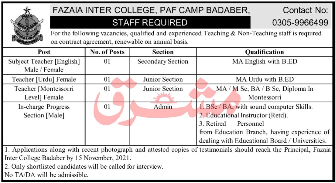 Vacancies in Fazaia Inter College Advertisement November 2021