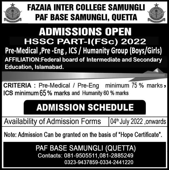 Fazaia Inter College HSSC Part I, Intermediate Part I, Fsc Pre Medical, FSc Pre Engineering, ICS, FA humanities admissions 2022 has been started. Eligible students who qualify as per admission criteria in Fazaia Inter College Quetta Balochistan Pakistan can apply in Science College for academic year 2022. Eligible candidates for admissions in ICS and Intermediate can apply as per Government institute criteria and before closing date 20 July 2022 after reading advertisement online. Read newspaper ad for exact details.