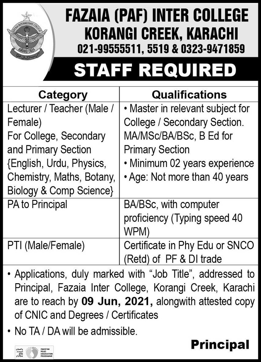 Vacancies in Fazaia PAF Inter College Advertisement May 2021