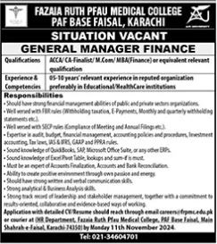 Latest Government jobs in Fazaia Ruth PFAU Medical College in Education and others can be applied till 11 November 2024 or as per closing date in newspaper ad. Read complete ad online to know how to apply on latest Fazaia Ruth PFAU Medical College job opportunities.