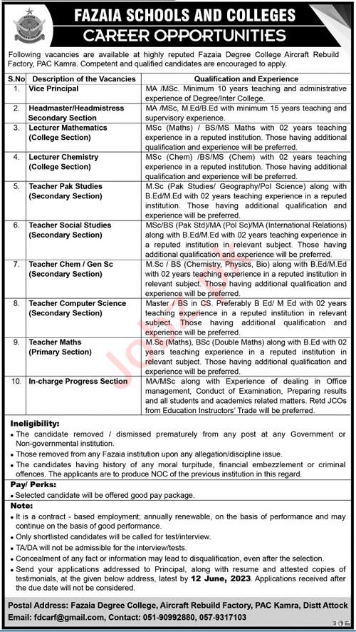 Fazaia Schools and Colleges jobs advertisement dated about 5 June 2023 in daily Ausaf Newspaper invites application for the vacant post of pak study teacher, math lecturer, social studies teacher, math teacher, general science teacher, chemistry lecturer, headmaster, incharge progress section, chemistry teacher, vice principal, headmistress and computer science teacher in Attock, attock Punjab Pakistan. Candidates with Master, M.sc, Bachelor and MA etc. educational background will be preferred.