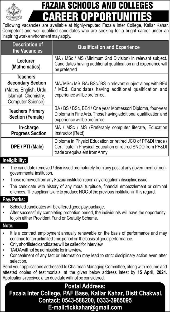 Vacant posts including urdu teacher, islamiat teacher, chemistry teacher, math teacher, computer science teacher, english teacher, primary teacher, incharge progress section, dpe and math lecturer are announced in Fazaia Schools and Colleges Chakwal, chakwal Punjab Pakistan as per 1 April 2024 advertisement in daily Express Newspaper. Educational qualifications required MA, Bachelor, Master, MS, BA and M.sc etc.