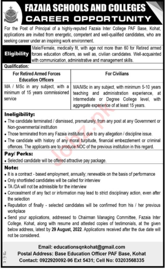 Fazaia Schools and Colleges jobs advertisement dated about 14 August 2022 in daily Jang Newspaper invites application for the vacant post of principal in Kohat, kohat Khyber Pakhtunkhwa KPK Pakistan. Candidates with Master, Bachelor, M.sc and MA etc. educational background will be preferred.
