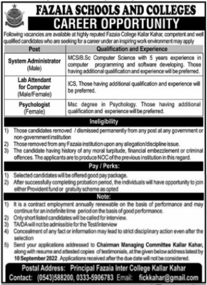 Fazaia Schools and Colleges established by Pakistan Air Force PAF jobs advertisement dated about 5 September 2022 in daily Nawaiwaqt Newspaper invites application for the vacant post of system administrator, lab attendant and psychologist in Chakwal, chakwal Punjab Pakistan. Preferred Education is BCS, Intermediate, M.sc, Others and MCS etc.