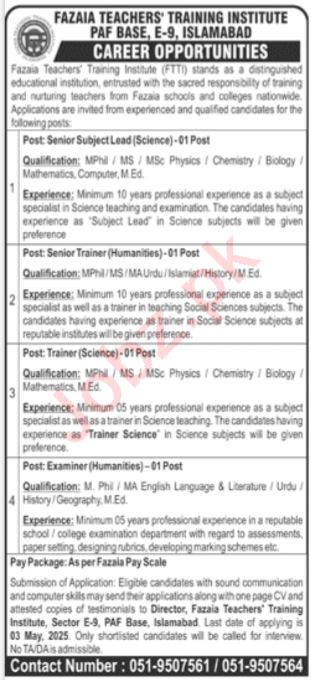 Latest Government jobs in Fazaia Teachers Training Institute Islamabad in Teaching and others can be applied till 3 May 2025 or as per closing date in newspaper ad. Read complete ad online to know how to apply on latest Fazaia Teachers Training Institute Islamabad job opportunities.