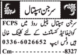 FCPS Consultant Jobs 2025 in Surgeon Hospital Quetta