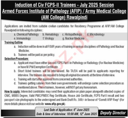 Armed Forces Institute of Pathology AFIP jobs advertisement dated about 18 May 2025 in daily Dunya Newspaper invites application for the vacant post of fcps ii trainee in Rawalpindi, rawalpindi Punjab Pakistan. MBBS etc. educational qualification will be preferred.