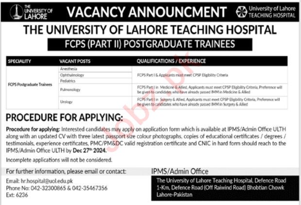 The University of Lahore Lahore, lahore Punjab Pakistan invites applications from eligible candidates for the post of fcps postgraduate trainees as per advertisement of December 22, 2024 published in daily Jang Newspaper. Persons with Others and MBBS etc. education can apply.