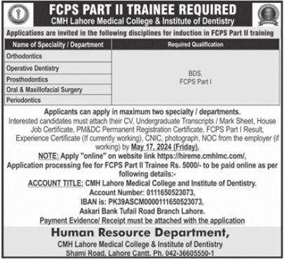 CMH Lahore Medical College Lahore, lahore Punjab Pakistan invites applications from eligible candidates for the post of fcps ii trainee as per advertisement of May 3, 2024 published in daily Jang Newspaper. Educational qualifications required BDS etc.