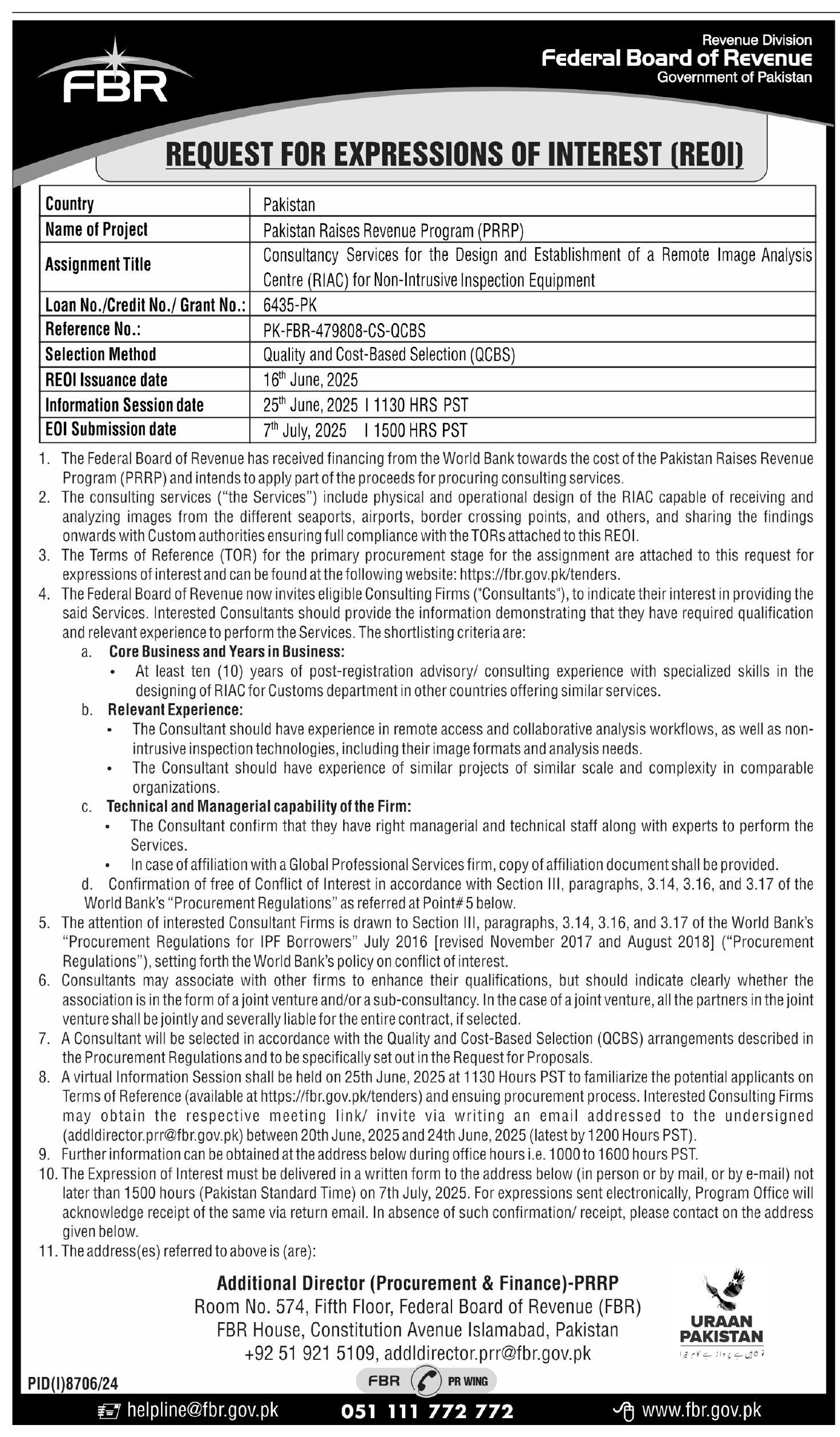 Federal Board of Revenue FBR jobs advertisement dated about 17 June 2025 in daily Express Tribune Newspaper invites application for the vacant post of consultancy service in Islamabad, islamabad Islamabad Pakistan. Educational qualifications required Master, Bachelor and MS etc.