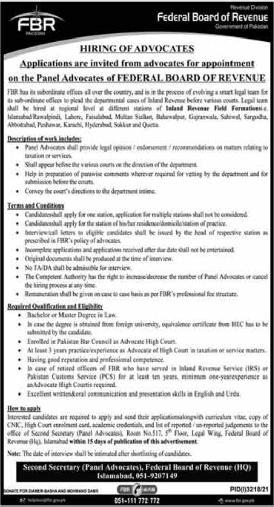 Latest Federal Board of Revenue FBR Legal Posts Islamabad 2025