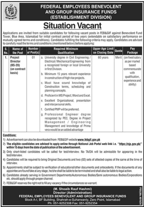 Federal Employees Benevolent & Group Insurance Funds Islamabad, islamabad Islamabad Pakistan invites applications from eligible candidates for the post of project director as per advertisement of January 10, 2025 published in daily The News Newspaper. Candidates with Bachelor, MS and Master etc. educational background will be preferred.
