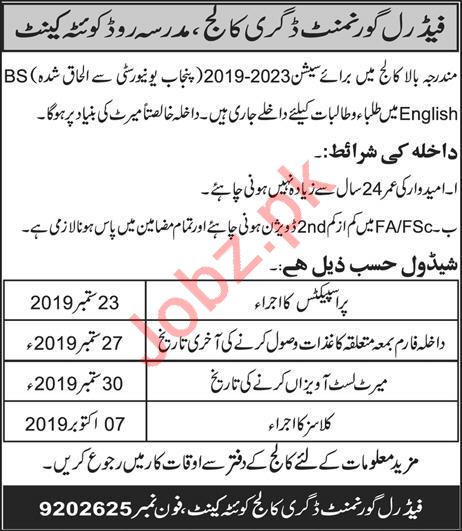 Federal Government Degree College is offering admissions in BS English in Quetta. Federal Government Degree College is affiliated with the University of the Punjab Lahore. Read newspaper ad for exact details.