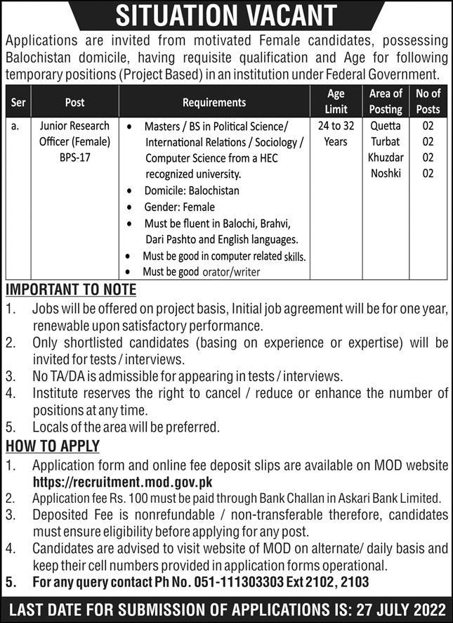 Federal Government Organization Quetta, quetta, khuzdar and turbat Balochistan Pakistan invites applications from eligible candidates for the post of research officer as per advertisement of July 17, 2022 published in daily Express Newspaper. Educational qualifications required BCS, Master and Bachelor etc.