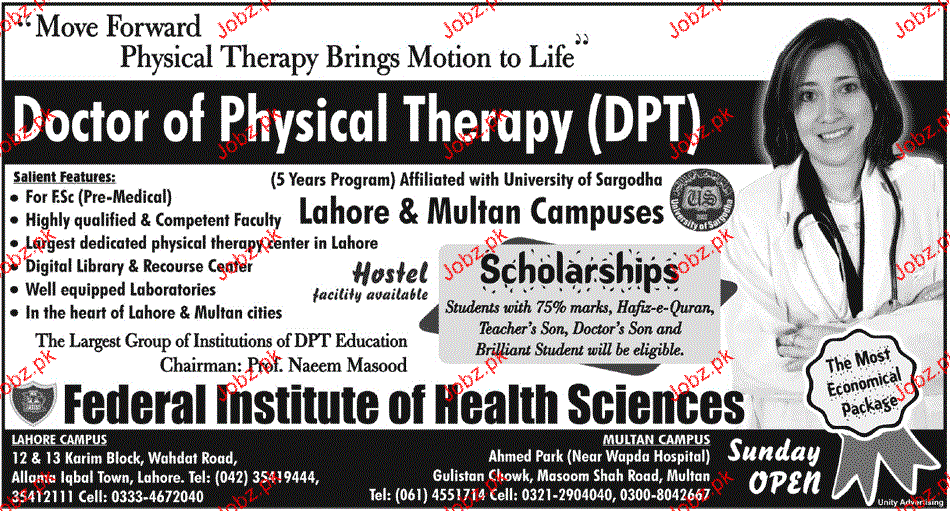 Federal Institute of Health Science Lahore Admission in DPT in Lahore Read newspaper ad for exact details.