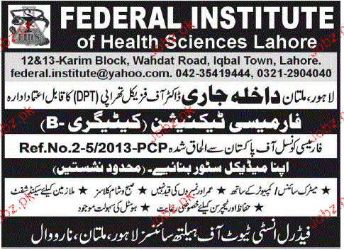 Federal Institute of Health Science Lahore Admission in Diploma in Pharmacy Technicians in Narowal Read newspaper ad for exact details.