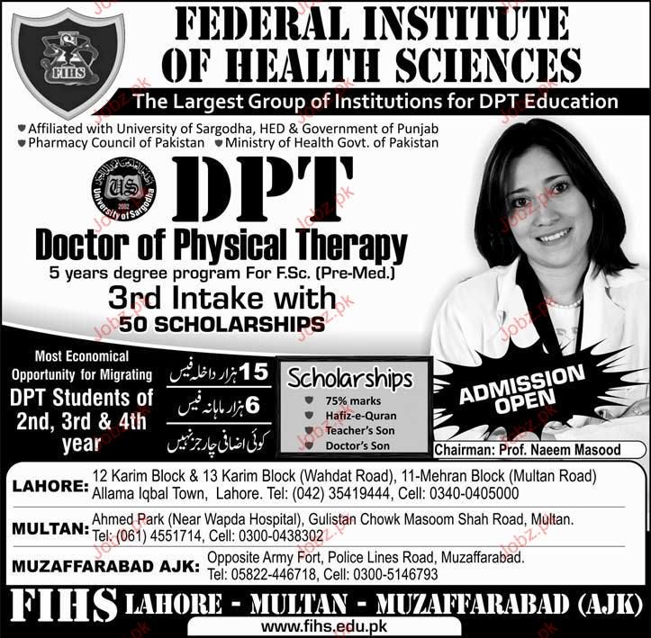 Federal Institute of Health Sciences Admission in DPT in Lahore. Read newspaper ad for exact details.