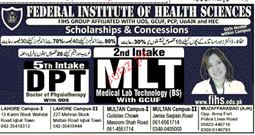 Federal Institute of Health Sciences Admission in DPT Doctor of Physical Therapty and Medical Lab Technology BS MLT in Lahore. Scholarship and Concessions. Read newspaper ad for exact details.