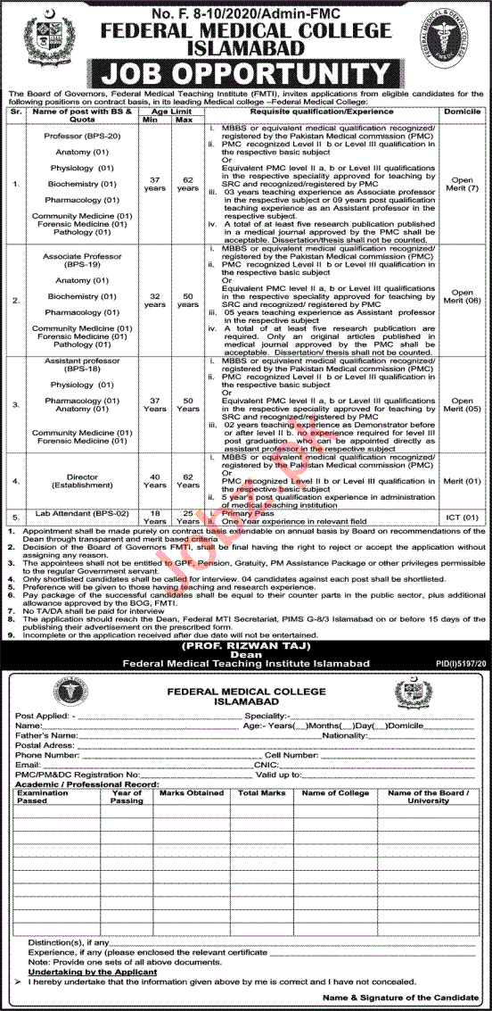 Vacancies in Federal Medical College FMC Advertisement March 2021