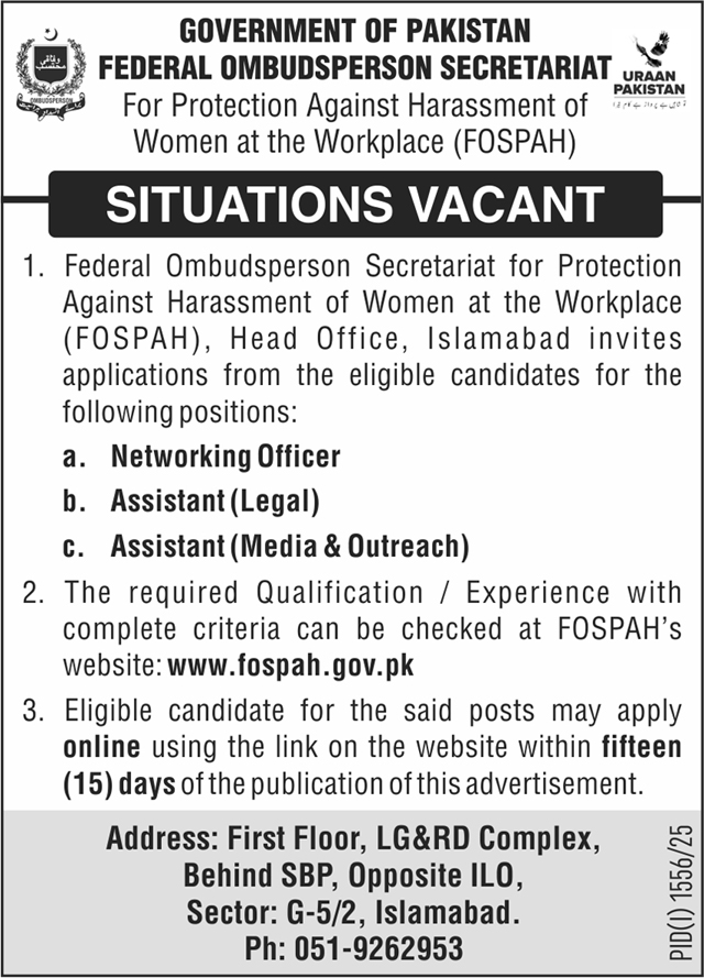Federal Ombudsperson Secretatiat for Protection Against Harassment jobs advertisement dated about 26 August 2025 in daily Nation Newspaper invites application for the vacant post of assistant media outreach, assistant legal and networking officer in Islamabad, islamabad Islamabad Pakistan. Educational qualifications required Intermediate, Bachelor, Master and MS etc.