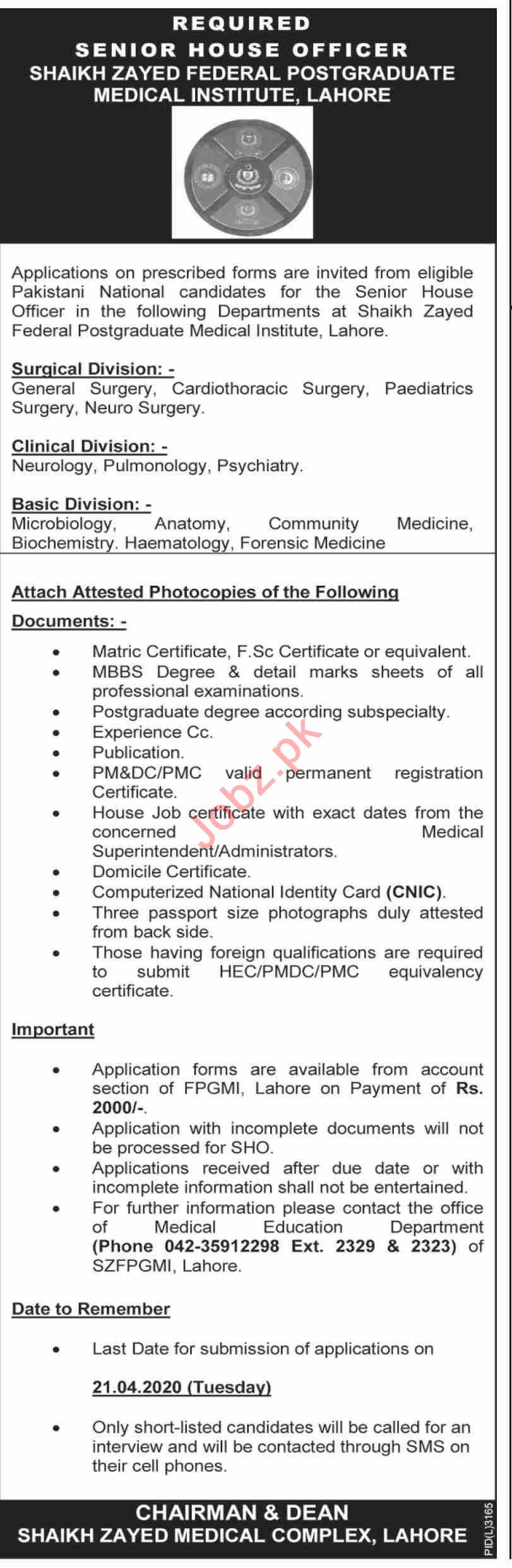 House Officer, Doctor, Consultant Neurology, Consultant Pulmonology, Consultant Psychiatry, Consultant Microbiology, Consultant Anatomy, Consultant Community Medicine, Consultant Biochemistry, Consultant Haematology, Consultant Forensic Medicine, Lady Doctor, Surgeon, Consultant Surgery, Consultant Cardio Thoracic Surgery, Consultant Paediatrics, Consultant Neuro Surgery seeks in Shaikh Zayed Federal Postgraduate Medical Institute SZFPGMI Lahore.