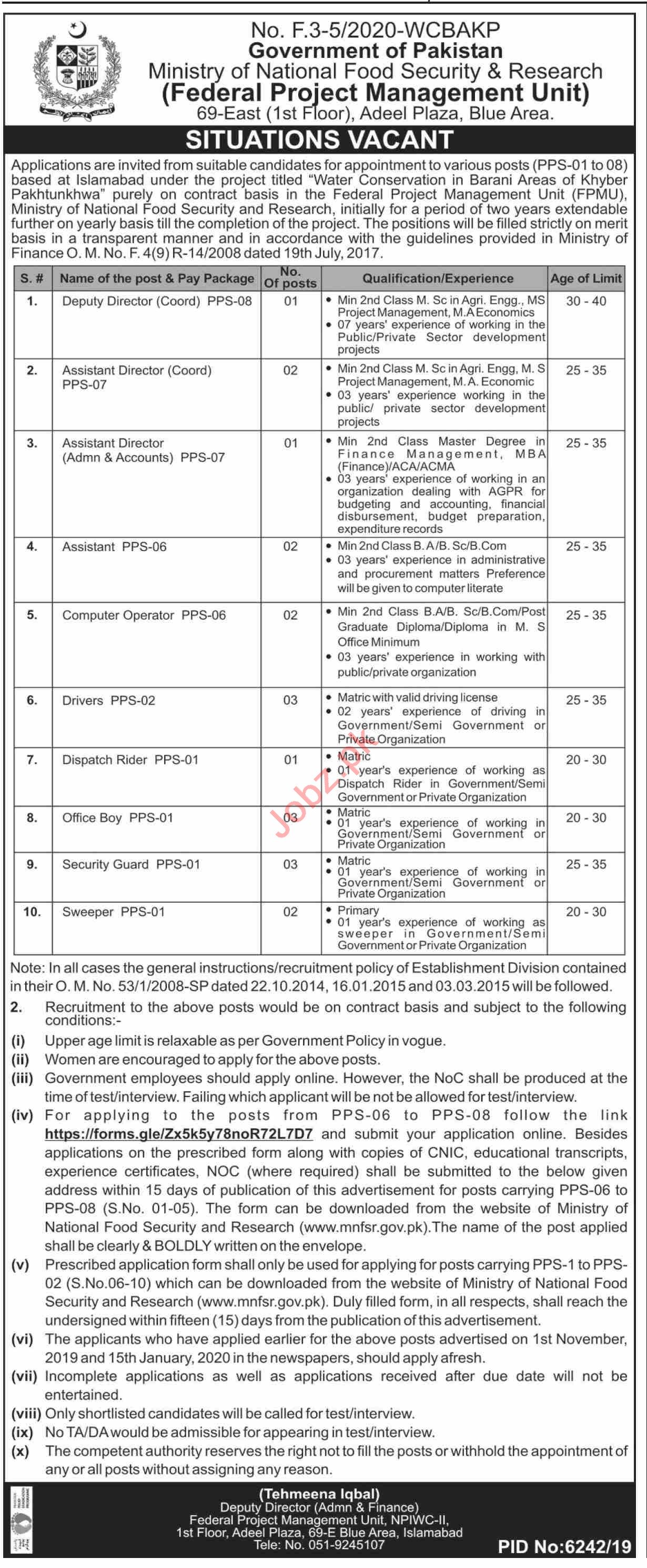 Water Conservation in Barani Areas of Khyber Pakhtunkhwa, Federal Project Management Unit FPMU, National Programme for Improvement of Watercourses NPIWC, Agriculture Department, Ministry of National Food Security & Research MNFSR, Government of Pakistan is seeking experienced individuals to fill the positions of Deputy Director, Deputy Director Coordination, Assistant Director Coordination, Assistant Director Admin, Assistant Director Accounts, Assistant, Computer Operator, Driver, LTV Driver, Dispatch Rider, Office Boy, Security Guard, Sweeper.