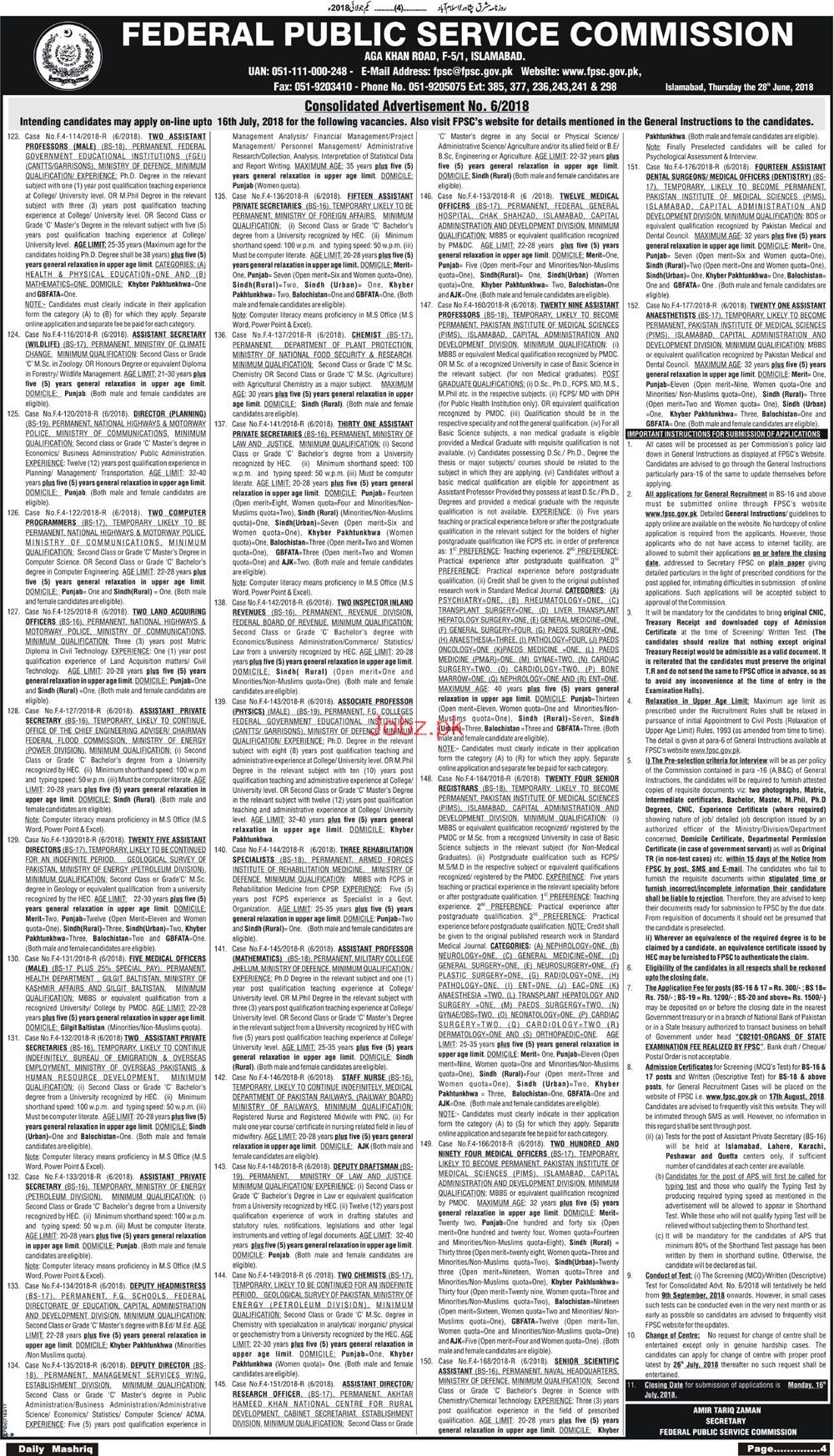 Male Assistant Professors in Federal Government Institute, Assistant Secretary, Director Planning in Highways & Motorways Police, Computer Programmer in Highways & Motorways Police, Assistant Private Secretary in Ministry of Energy & Power, Assistant Directors in Geology Survey of Pakistan, Medical officers in Health Department, Rehabilitation Specialists in Ministry of Defence, Inspector Land & Revenue in Federal Board of Revenue FBR, Director and Senior Registrar in PIMS Through Federal Public Service Commission FPSC in Islamabad