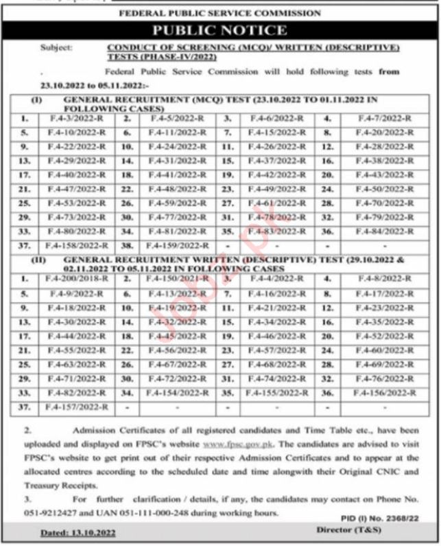 Federal Public Service Commission FPSC invites applications for job positions advertised in daily Nawaiwaqt dated 16 October 2022 for following vacancies in Multan, multan Punjab Pakistan.