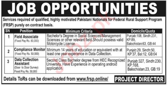 Vacant posts including field associate, data collection assistant and compliance monitor are announced in Federal Rural Support Program FRSP Peshawar, quetta and peshawar Khyber Pakhtunkhwa KPK Pakistan as per 12 June 2023 advertisement in daily Mashriq Newspaper. Persons with MS, Bachelor and Master etc. education can apply.