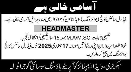 Federal Science College Gujranwala Headmaster Jobs 2025