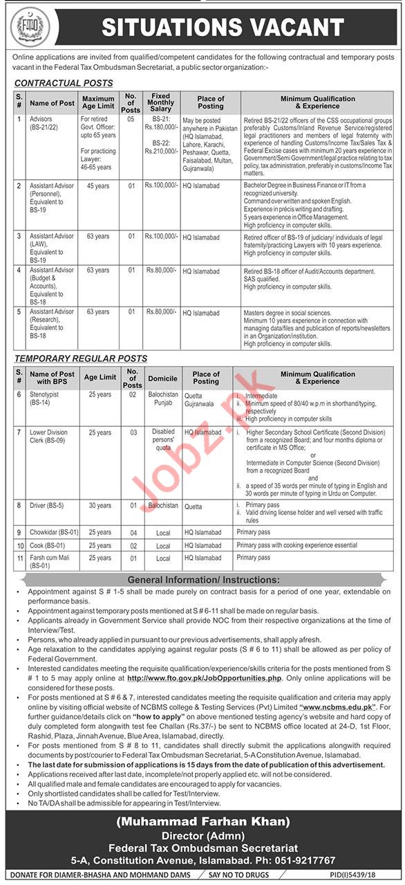Federal Tax Ombudsman FTO Islamabad, Government of Pakistan are seeks candidates for the posts of Advisor, Assistant Advisor, Assistant Advisor Law, Assistant Advisor Accounts, Assistant Advisor Budget, Assistant Advisor Research, Steno Typist, LDC, Driver, Chowkidar, Cook, Mali.