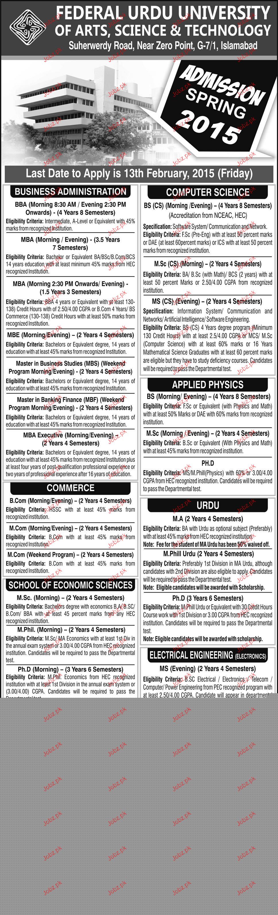 Federal Urdu University Admission in BBA, BS, B.COm, MSc in l Islamabad. Read newspaper ad for exact details.